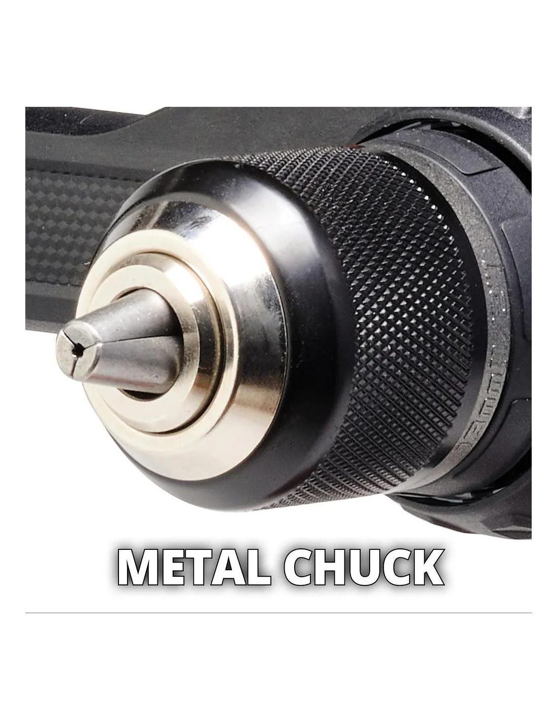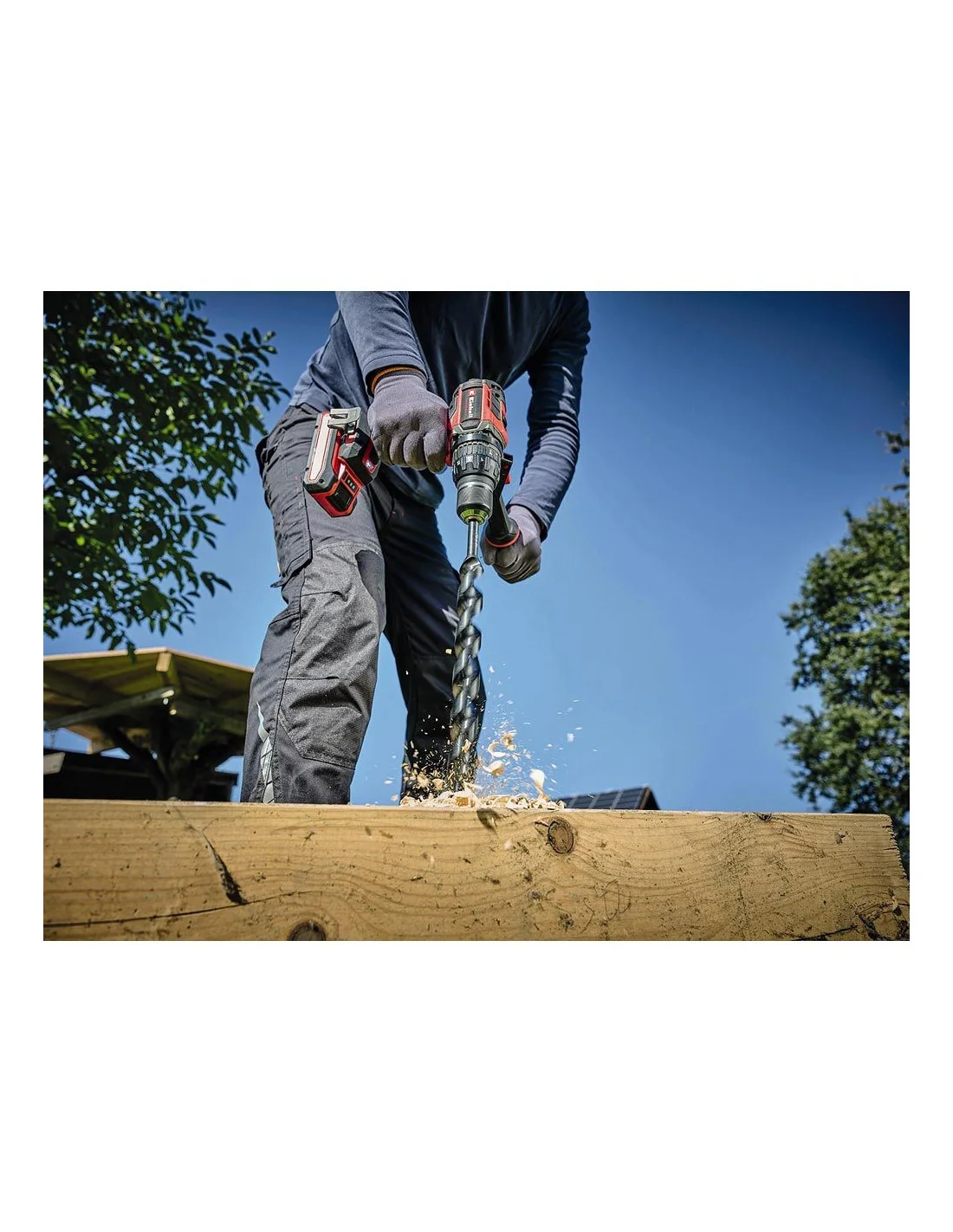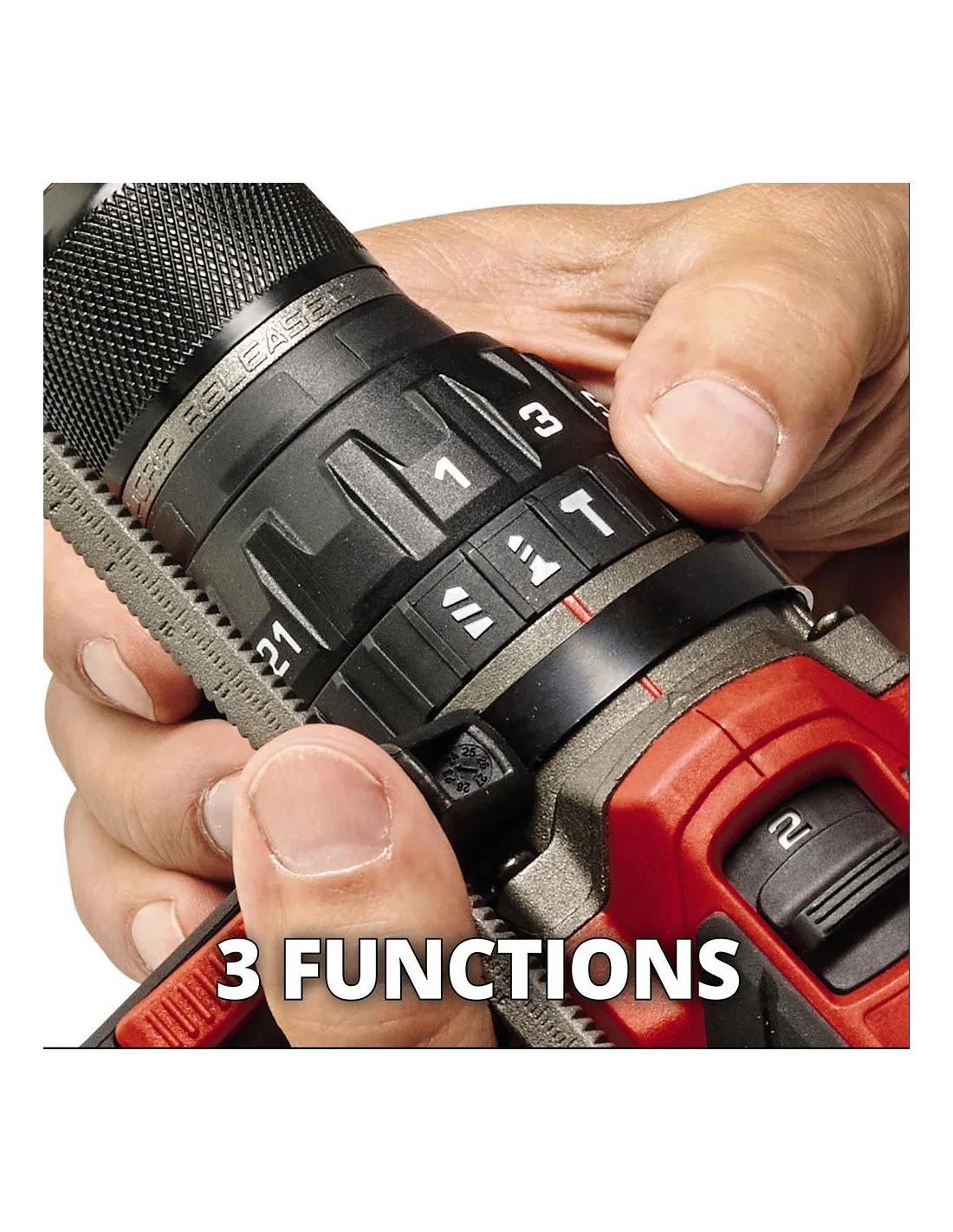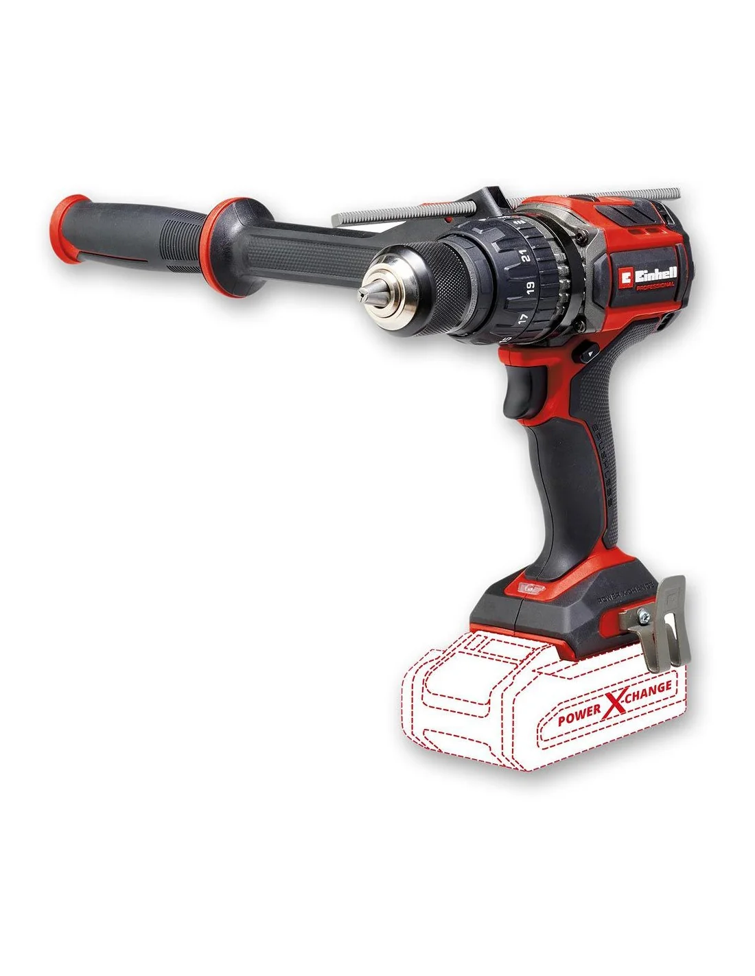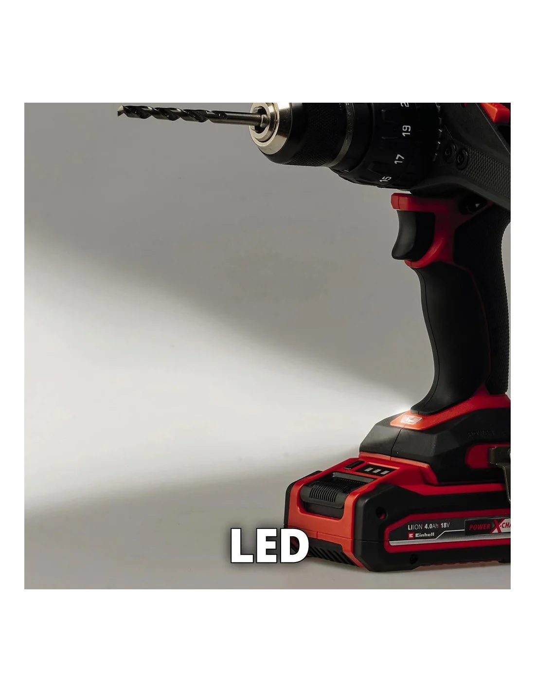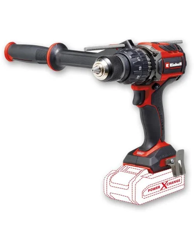 The Einhell TP-CD 18/120 Li-i BL-Solo Power X-Change Combi Drill is powered by an Einhell PurePOWER brushless motor. This brushless motor offers more power and a longer running time than conventional carbon brush motors. Once you register online, the brushless motor has a 10-year warranty. With its impact drilling function, it supports professional craftsman when working on resistant materials such as stone or concrete. In addition, the impact drill has a 2-speed gearbox which allows fast screwing, drilling and powerful impact drilling. The torque-slip clutch prevents screws from being overtightened. The hard torque of 120Nm is adjustable over 21 torque levels. The impact drill/driver also offers a drilling stage and an impact drilling stage. The infinitely variable speed electronics support application and material appropriate work. The single-sleeve 13mm metal quick-release chuck made of metal with locking function allows a quick and easy change of the tool. Safe and wrist-friendly operation is ensured by the additional handle with softgrip. The LED light provides a good view of the work area even in poor visibility. For safe storage, the impact drill can be easily attached to the belt with the belt clip. Powered by Lithium-ion rechargeable batteries with a battery management system for a long life. Part of the Power X-Change series of tools, 3 Year Einhell Warranty, registration within 30 days required. Supplied as body only (no battery or charger). Specifications: Drill Chuck: 13mm Single Sleeve. No Load Speed: 500/2,100/min. Impact Rate: 6,500/27,300/bpm. Max. Torque: 120Nm. Torque Settings: 21 + 1 + 1 Settings. Weight: 1.71kg.-bg
