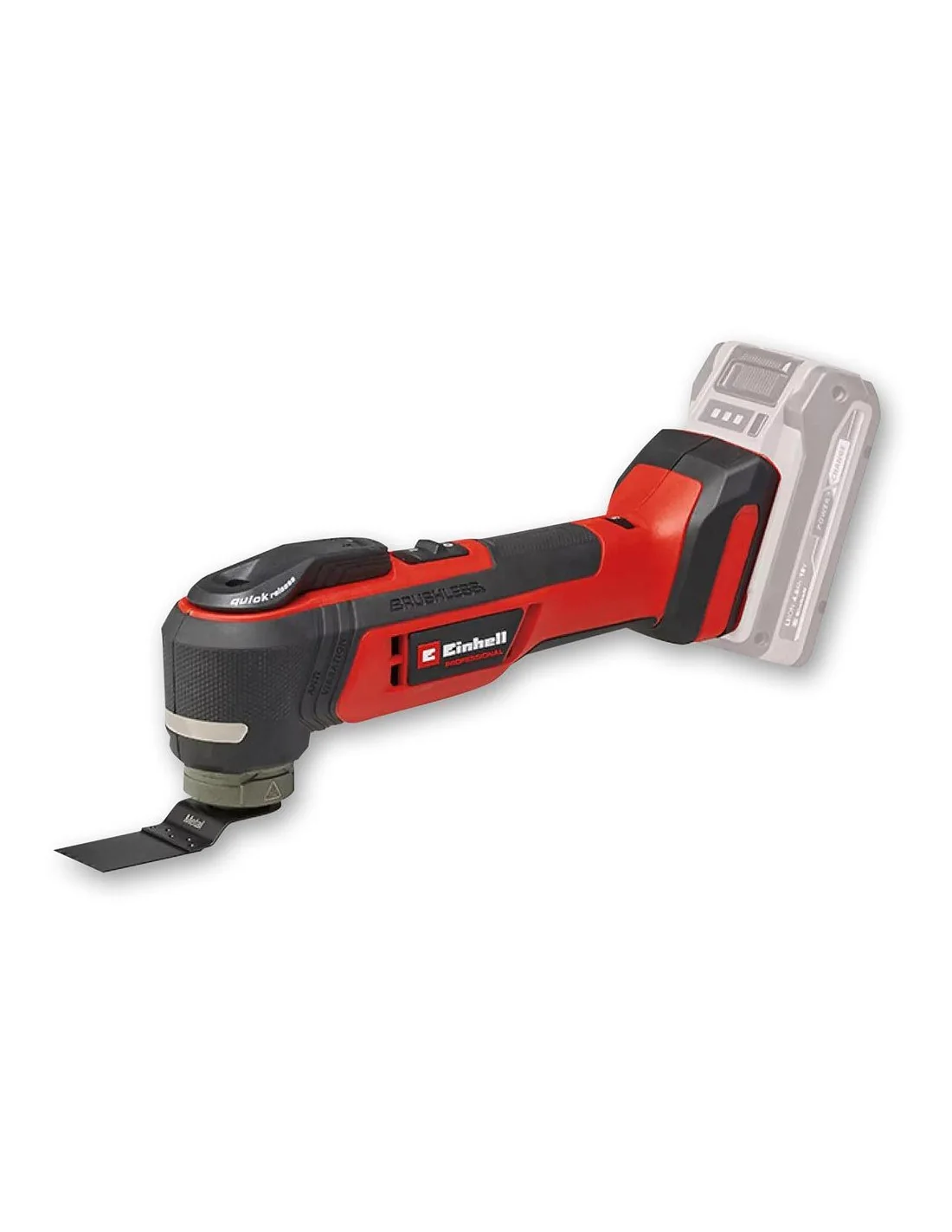 The Einhell TP-MG 18 Li BL-Solo Power X-Change Multifunctional Tool is a versatile and high-quality device for construction and renovation work. Thanks to its extensive equipment, tasks such as sawing, sanding or scraping can be carried out effortlessly. Powered by a Einhell PurePOWER brushless motor. This brushless motor offers more power and a longer running time than conventional carbon brush motors. Once you register online, the brushless motor has a 10-year warranty. Speed electronics ensure precise and material-friendly working. The multitool works with an oscillation angle of 3.2Β°, which enables precise use. A switch with locking function facilitates time-intensive work. The innovative, vibration-decoupled device head enables vibration-free application. Whilst softgrip surfaces ensure safe and comfortable working. The tool-free accessory change is made possible by the quick-release lock. Thanks to the magnetic tool adapter, accessories can be changed quickly and easily. The 12-pin tool adapter allows flexible positioning of accessories. It also features an LED light that ensures that the working area is perfectly lit. Part of the Power X-Change family. Powered by Lithium-ion rechargeable batteries with a battery management system for a long life. Supplied with: 1 x Delta Sanding Shoe with Velcro Fastener, 1 x Diamond Segment Saw Blade for tile joints, 1 x Segment HSS Saw Blade for wood, plastic and soft metal, 1 x BIM Plunge Cut Saw Blade for metal and 1 x HCS Plunge Cut Saw Blade for wood and plastic. Part of the Power X-Change series of tools, 3 Year Einhell Warranty, registration within 30 days required. Supplied as body only (no battery or charger). Specifications: Oscillating Speed: 22,000 - 40,000/min. No Load Speed: 11,000 - 20,000/min. Angle of Oscillation: 3.2Β°. Sandpaper Size: 93 x 93 x 93mm. Weight: 1.08kg.-bg