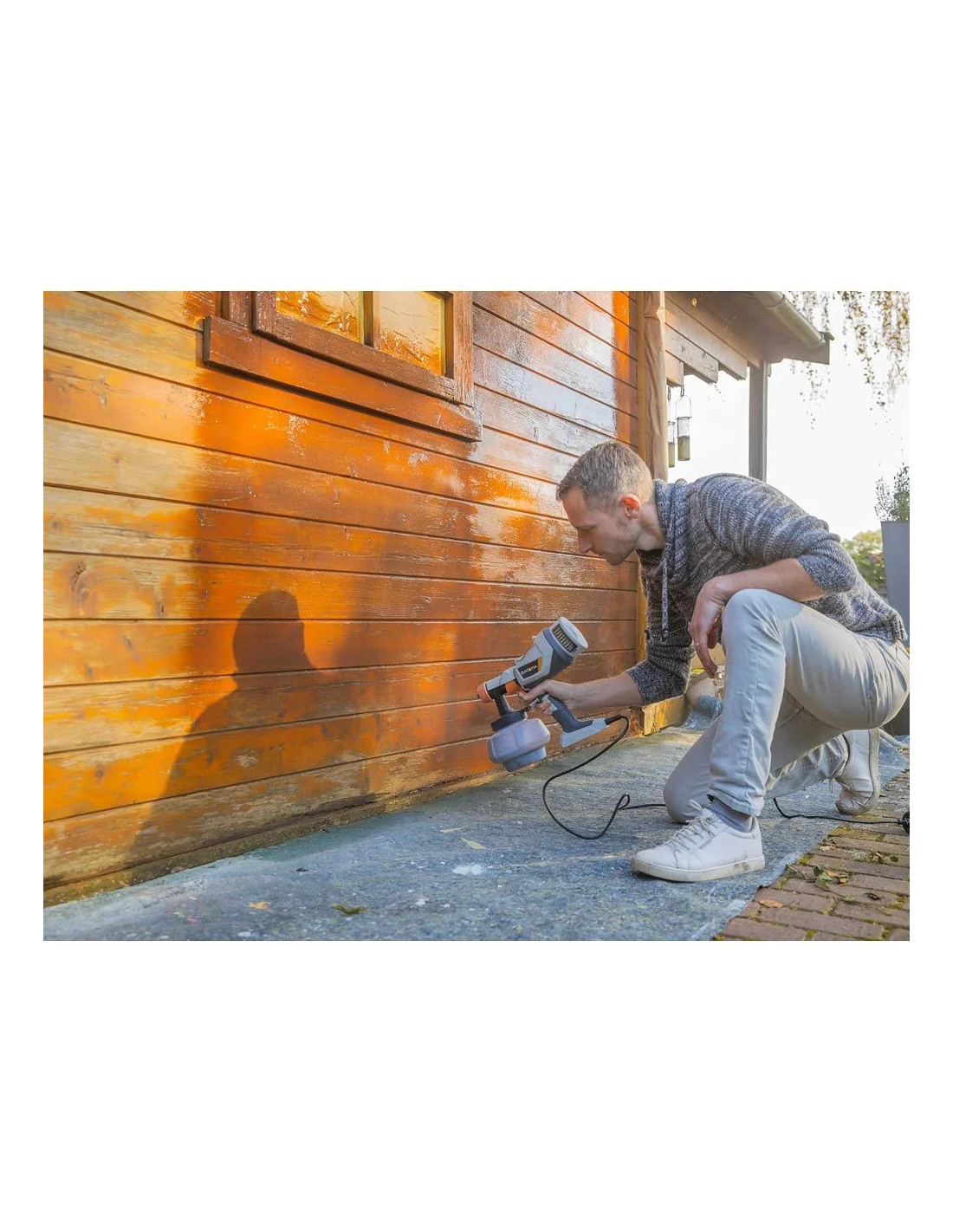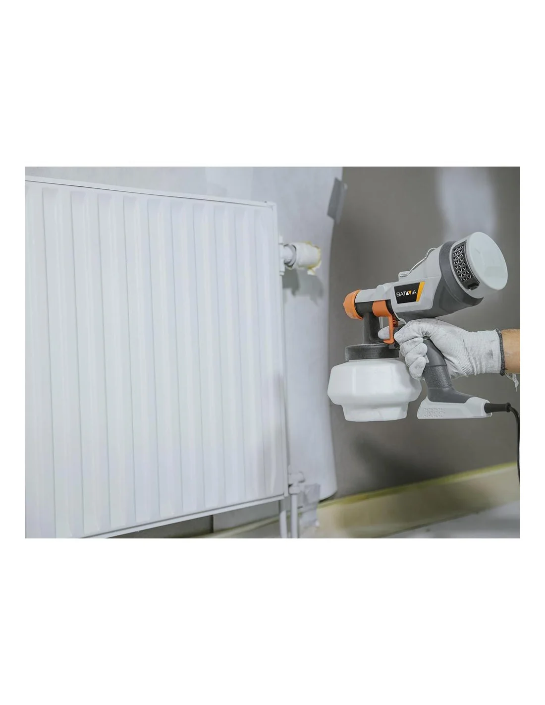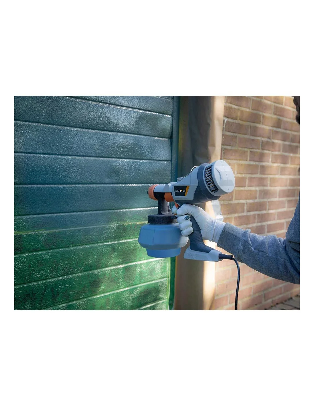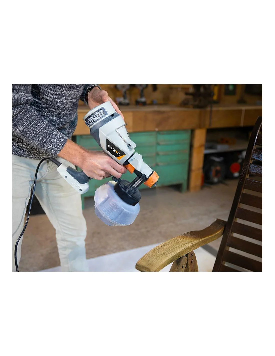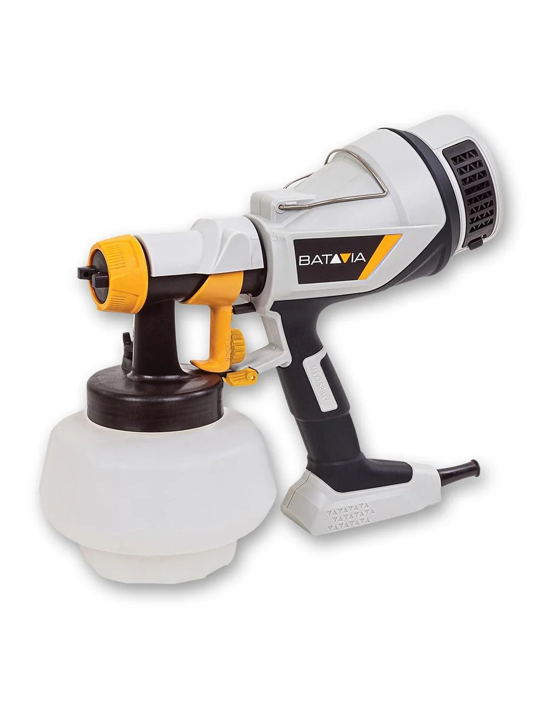 The Batavia MAXXSPRAY Paint Sprayer makes small to medium painting projects fast, easy, and professional. Whether you're tackling ceilings, fences, furniture, walls, or cabinets, this sprayer delivers a smooth, high-quality finish in no time. Compatible with a wide range of materials-including common paints, varnishes, thinned chalk, enamel, primers, and undercoats-it features adjustable flow control for full coverage with minimal overspray. Its lightweight, compact design ensures easy one-handed operation, while preventing leaks, splashes, and blockages. To keep performance at its best, clean the sprayer immediately after use to avoid clogging as materials dry. Specifications: Input Power: 500W Flow Rate: 900 ml/min Capacity: 1.2 litres