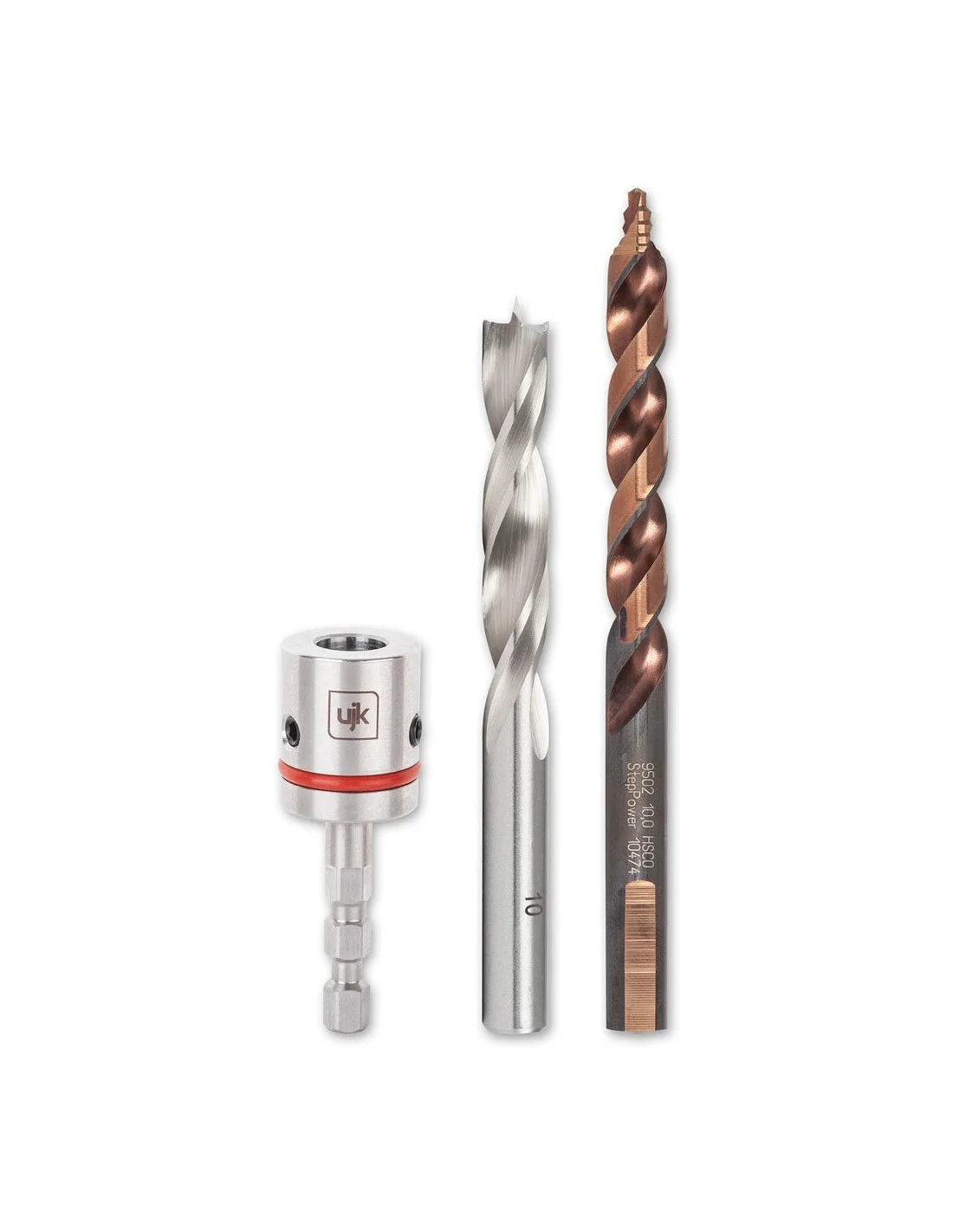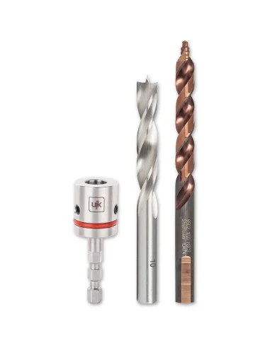Комплектът свредла UJK Hex Shank Adaptor Ultimate съчетава три от най-добрите решения за пробиване на UJK в един универсален комплект: адаптера за свредла UJK Hex Shank, свредлата UJK StepPower HSCO и свредлата UJK M2 HSS Premium Brad Point за избрани размери. Заедно те ви осигуряват скоростта и удобството на бързосменяемите адаптери, издръжливостта и режещата мощност на кобалтовите свредла за метал и твърда дървесина, както и точността на прецизно заточените свредла Brad Point за чиста обработка на дърво. Независимо дали работите с дървен материал, инженерни плоскости, акрил или метал, този комплект гарантира, че винаги имате правилния свредел, готов за постигане на точни и ефикасни резултати.